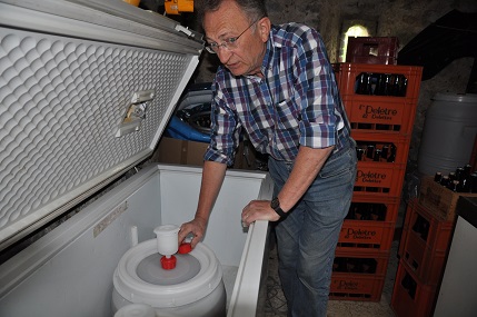 Le moût refroidi à 25°C vient d'etre ensemencé pour fermentation en caisson isotherme. Le barboteur en sommet de cuves sert à laisser le gaz carbonique s'échapper sans que de l'air n'entre dans la cuve (anaérobie)