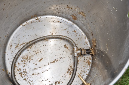 Fond de cuve de brassage : on reconnait le filtre à dreches composé d'une spire d'inox, tres efficace
