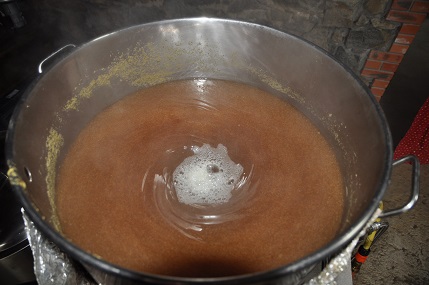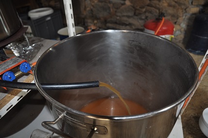 le houblonnage est fini (une heure sous ebullition) : avant refroidissement par l'échangeur à plaques, il faut amalgamer les matières (houblons, protéines) par un vortex